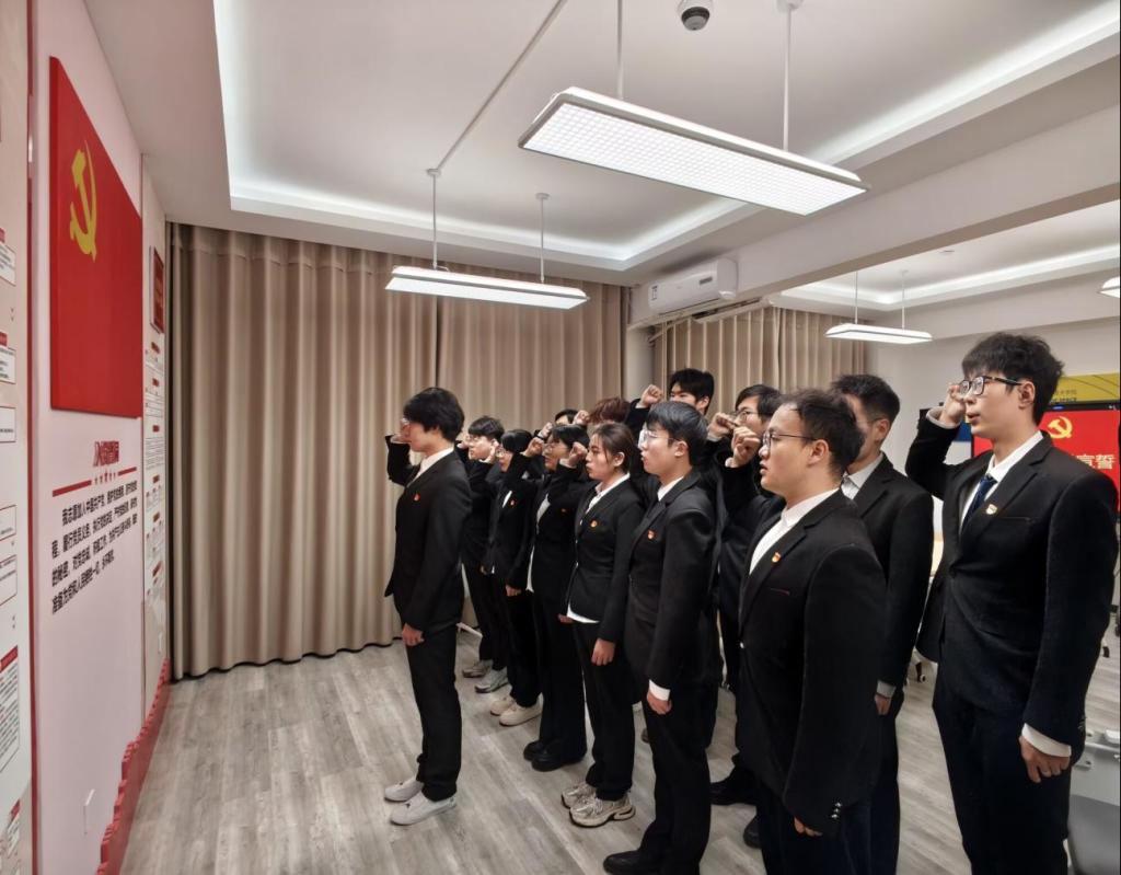 仪式在雄壮的《国际歌》中拉开序幕。王亚飞宣读了新发展党员名单。随后,在领誓人的带领下,新党员面向鲜红的党旗,高举右拳,郑重许下为共产主义奋斗终身的誓言。铿锵誓言彰显了新党员们对党的忠诚与坚定信念。
