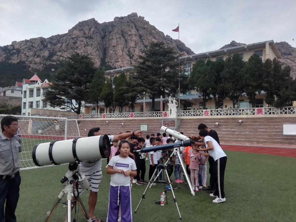 近日,观测站在完成科研数据采集的基础上,利用已有的观测设施,开展了一系列的天文科学普及活动,服务于荣成区域的中小学生与群众。在院夼村委东侧广场开展了月球观测活动,当地居民通过25厘米和12厘米口径的光学望远镜观测月球;在院夼小学进行了科普讲座,向小学生讲解了天文望远镜的故事,并帮助其通过望远镜进行观测。这些科普宣传活动,受到当地群众的一致好评,大家都纷纷表示通过科普活动增加了对天文知识的了解。